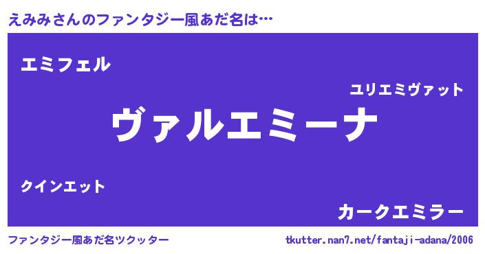 | 男性向けラノベタイトル風あだ名 | 『魔弾の王とえみみ』『えみみの憂鬱』 |