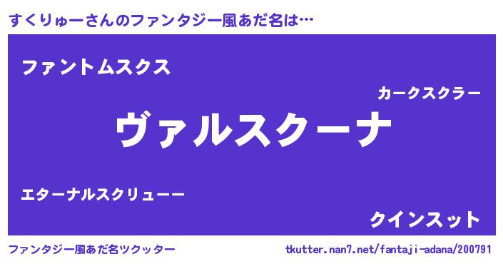 | 男性向けラノベタイトル風あだ名 | 『魔弾の王とすくりゅー』 |