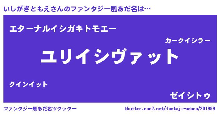 | 男性向けラノベタイトル風あだ名 | 『いしがきともえ~年齢イコール彼女いない歴の魔法使い~』 |