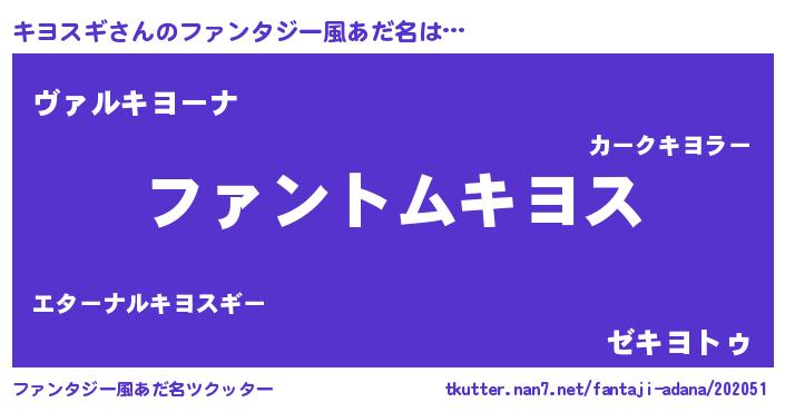 | 男性向けラノベタイトル風あだ名 | 『ダンジョンにキヨスギを求めるのは間違っているだろうか』 |
