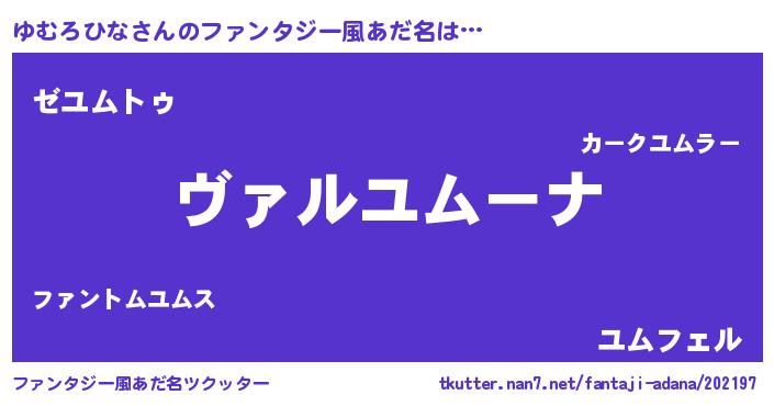 | 男性向けラノベタイトル風あだ名 | 『魔弾の王とゆむろひな』 |