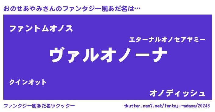 | 女子向けラノベタイトル風あだ名 | 『乙女ゲームの破滅フラグしかない悪役おのせあやみに転生してしまった…』 |