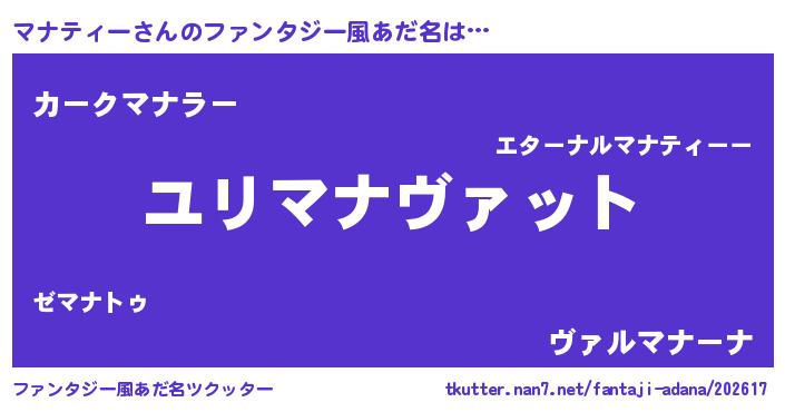 | 女子向けラノベタイトル風あだ名 | 『マナティーの玉の輿計画!』 |