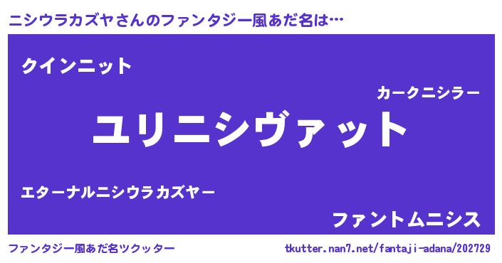 | 女子向けラノベタイトル風あだ名 | 『ニシウラカズヤの玉の輿計画!』 |