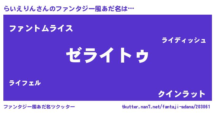 | 男性向けラノベタイトル風あだ名 | 『Re:らいえりんから始める異世界生活』 |
