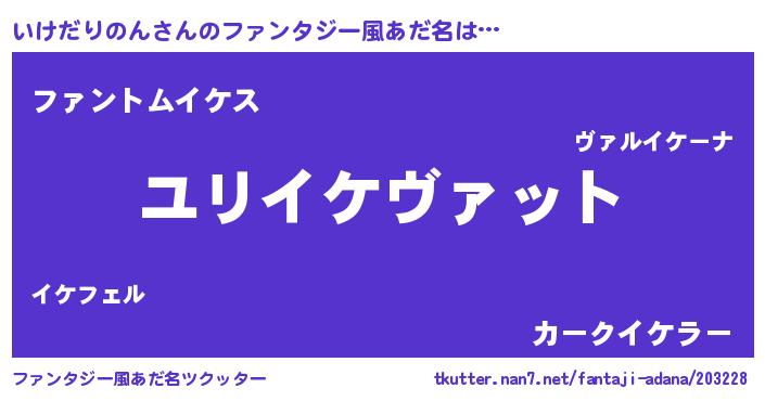 | 男性向けラノベタイトル風あだ名 | 『いけだりのん~年齢イコール彼女いない歴の魔法使い~』 |