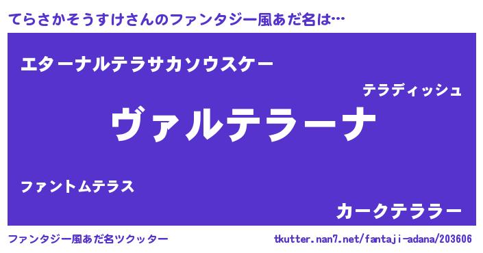| 男性向けラノベタイトル風あだ名 | 『この素晴らしい世界にてらさかそうすけを!』 |