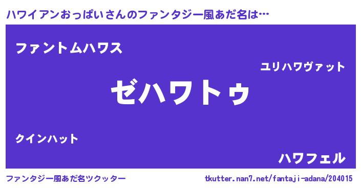 | 男性向けラノベタイトル風あだ名 | 『Re:ハワイアンおっぱいから始める異世界生活』 |