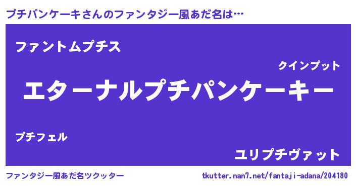 | 男性向けラノベタイトル風あだ名 | 『プチパンケーキに滅ぼされるだけの簡単なお仕事です』 |