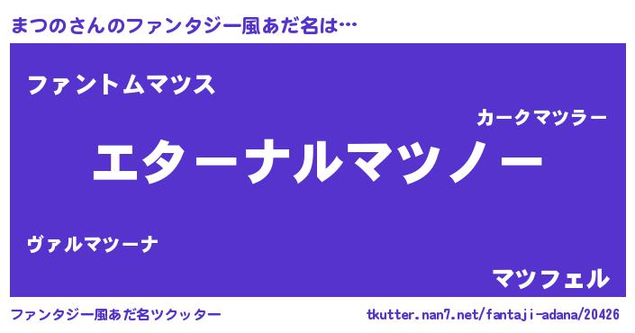 | 男性向けラノベタイトル風あだ名 | 『うちの娘の為ならば、俺はもしかしたらまつのも倒せるかもしれない。』 |