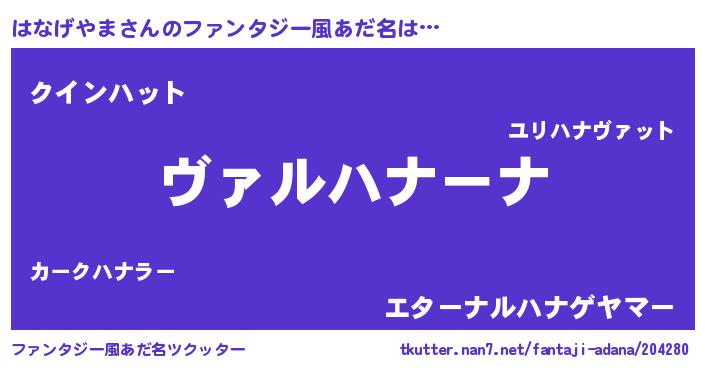 | 男性向けラノベタイトル風あだ名 | 『魔弾の王とはなげやま』 |