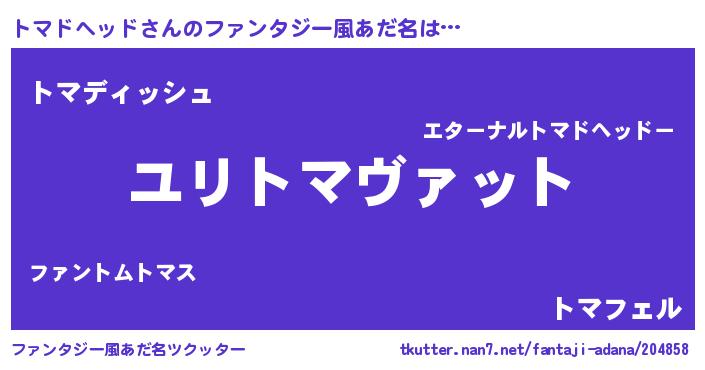 | 男性向けラノベタイトル風あだ名 | 『トマドヘッド~年齢イコール彼女いない歴の魔法使い~』 |