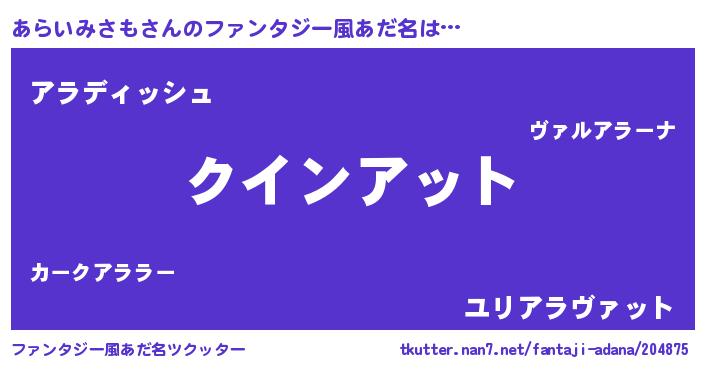| 男性向けラノベタイトル風あだ名 | 『おまえをオタクにしてやるから、俺をあらいみさもにしてくれ! 』 |