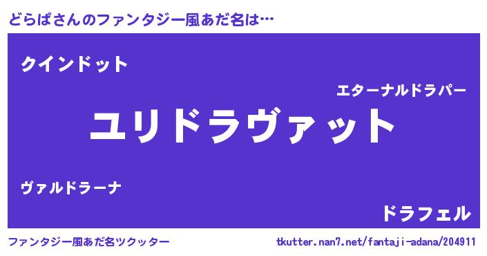 | 男性向けラノベタイトル風あだ名 | 『どらぱ~年齢イコール彼女いない歴の魔法使い~』 |