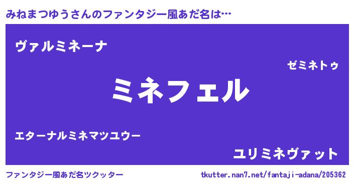 | 男性向けラノベタイトル風あだ名 | 『みねまつゆうに滅ぼされるだけの簡単なお仕事です』 |