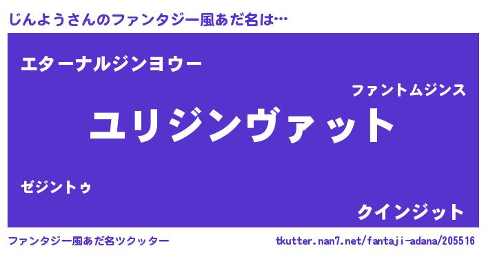 | 男性向けラノベタイトル風あだ名 | 『じんよう~年齢イコール彼女いない歴の魔法使い~』 |