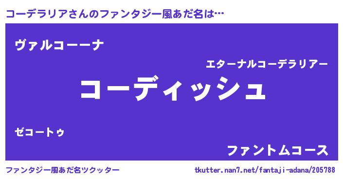 | 男性向けラノベタイトル風あだ名 | 『誰もが恐れるあのコーデラリアが、ぼくの専属メイドになるようです。』 |