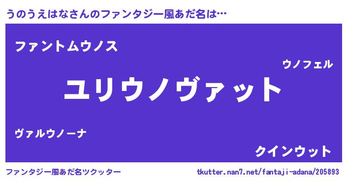 | 男性向けラノベタイトル風あだ名 | 『うのうえはな~年齢イコール彼女いない歴の魔法使い~』 |