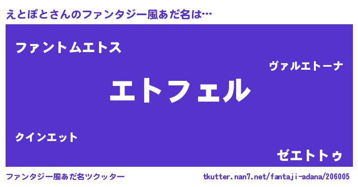 | 男性向けラノベタイトル風あだ名 | 『えとぽとの憂鬱』『魔弾の王とえとぽと』 |