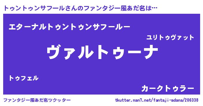 | 女子向けラノベタイトル風あだ名 | 『乙女ゲームの破滅フラグしかない悪役トゥントゥンサフールに転生してしまった…』 |