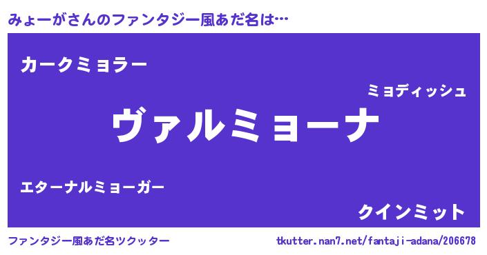 | 男性向けラノベタイトル風あだ名 | 『魔弾の王とみょーが』 |