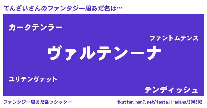| 男性向けラノベタイトル風あだ名 | 『魔弾の王とてんざい』 |