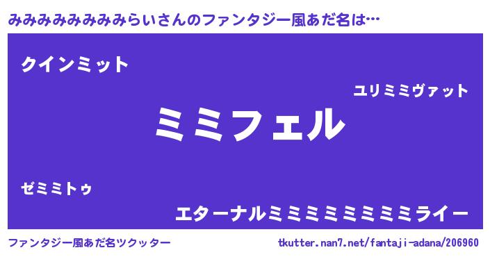 女子向けラノベタイトル風あだ名 | 『(仮)みみみみみみみみらいのやんごとなき事情』 |