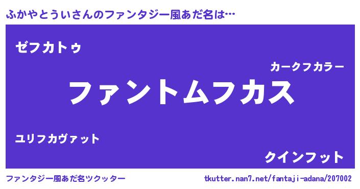 | ポケモン風あだ名 | 『ヒフカヤトウイ』『フカセウス』 |