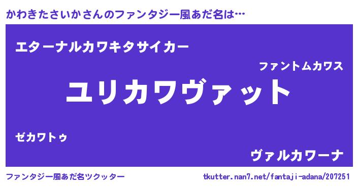 男性向けラノベタイトル風あだ名 | 『カワキタサイカスレイヤー』 |