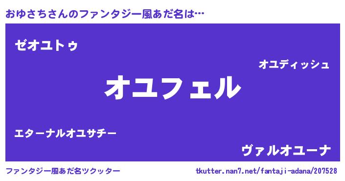 | 男性向けラノベタイトル風あだ名 | 『おゆさちの憂鬱』『魔弾の王とおゆさち』 |