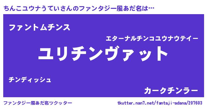 | 男性向けラノベタイトル風あだ名 | 『ちんこユウナうてい~年齢イコール彼女いない歴の魔法使い~』 |