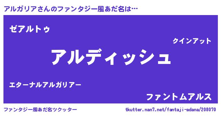 | 意味不明あだ名 | 『永久保存アルガリア』『自称アルガリア』 |