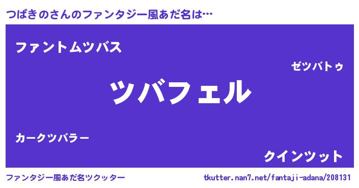 | 自動車の名前っぽいあだ名 | 『ツバティマ』『ツルトバパン』 |