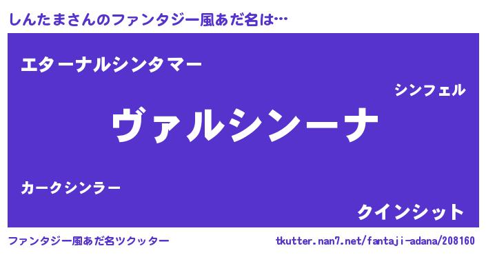 | 男性向けラノベタイトル風あだ名 | 『魔弾の王としんたま』『しんたまの憂鬱』 |