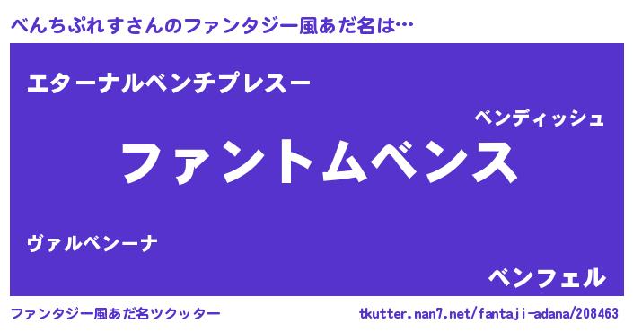 | 男性向けラノベタイトル風あだ名 | 『べんちぷれすの嫁は女の子じゃないと思った?』 |