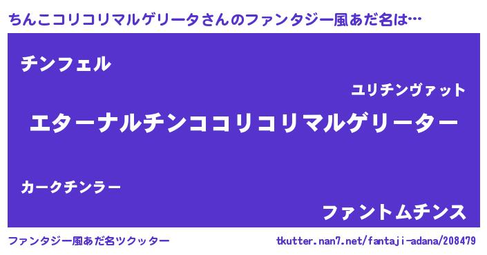 | 女子向けラノベタイトル風あだ名 | 『ちんこコリコリマルゲリータの雑貨屋さん』 |
