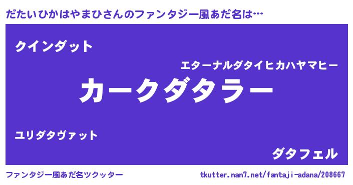 | 男性向けラノベタイトル風あだ名 | 『うちのだたいひかはやまひが世界を掌握している!』 |