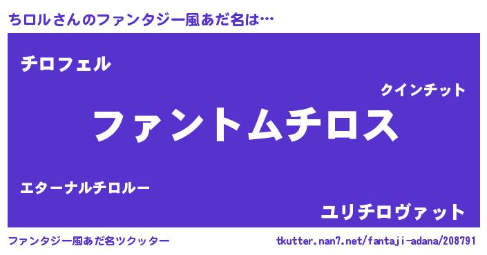 | 女子向けラノベタイトル風あだ名 | 『ちロルの卵を拾いまして』 |