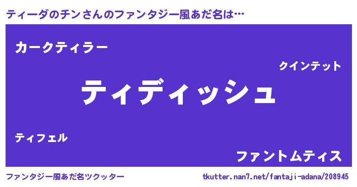 | 男性向けラノベタイトル風あだ名 | 『ティーダのチンという概念が存在しない退屈な世界 』 |