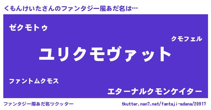 | 男性向けラノベタイトル風あだ名 | 『くもんけいた~年齢イコール彼女いない歴の魔法使い~』 |