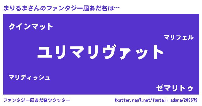 | 男性向けラノベタイトル風あだ名 | 『まりるま~年齢イコール彼女いない歴の魔法使い~』 |