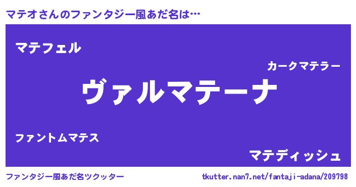 | 男性向けラノベタイトル風あだ名 | 『魔弾の王とマテオ』 |