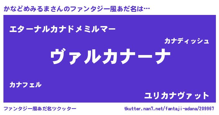 | 男性向けラノベタイトル風あだ名 | 『魔弾の王とかなどめみるま』 |