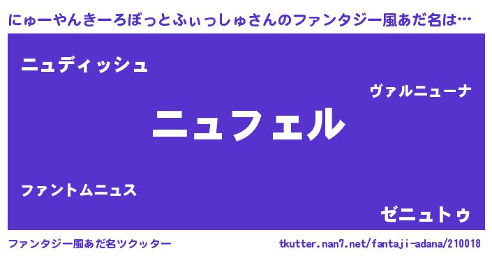 | 男性向けラノベタイトル風あだ名 | 『ニューヤンキーロボットフィッシュアートオンライン』 |