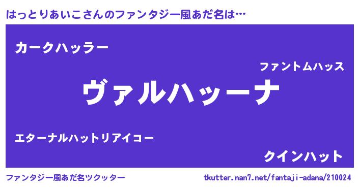| 男性向けラノベタイトル風あだ名 | 『魔弾の王とはっとりあいこ』 |