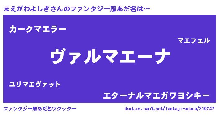 | 男性向けラノベタイトル風あだ名 | 『魔弾の王とまえがわよしき』 |