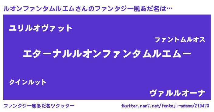 | 男性向けラノベタイトル風あだ名 | 『やはりルオンファンタムルエムの青春ラブコメはまちがっている 』 |