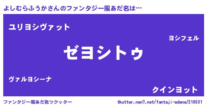 | 男性向けラノベタイトル風あだ名 | 『Re:よしむらふうかから始める異世界生活』 |