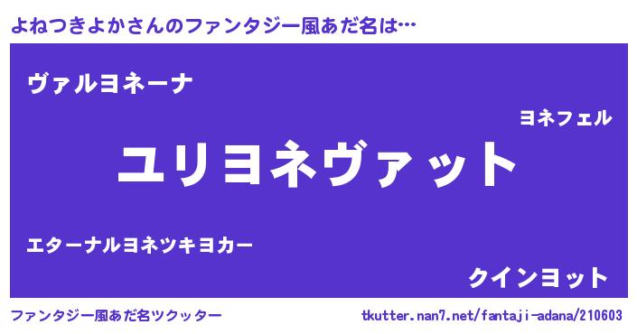 | 男性向けラノベタイトル風あだ名 | 『よねつきよか~年齢イコール彼女いない歴の魔法使い~』 |
