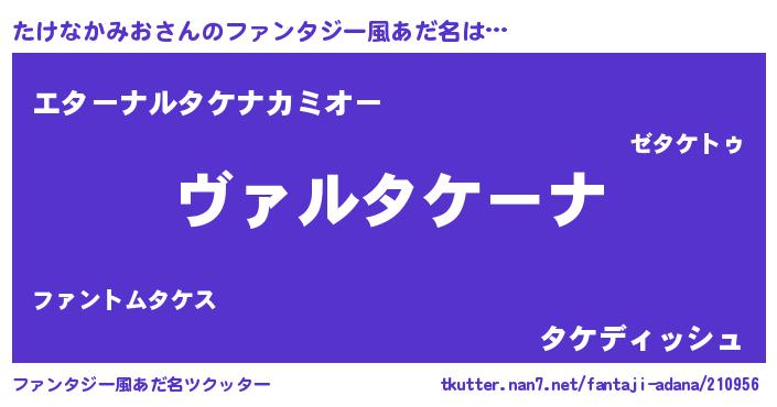 | 男性向けラノベタイトル風あだ名 | 『魔弾の王とたけなかみお』 |